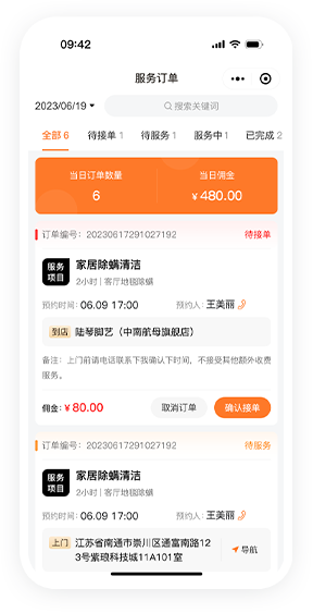 员工中心查看服务订单数据,确认接单、扫码签到等操作推进服务进程。