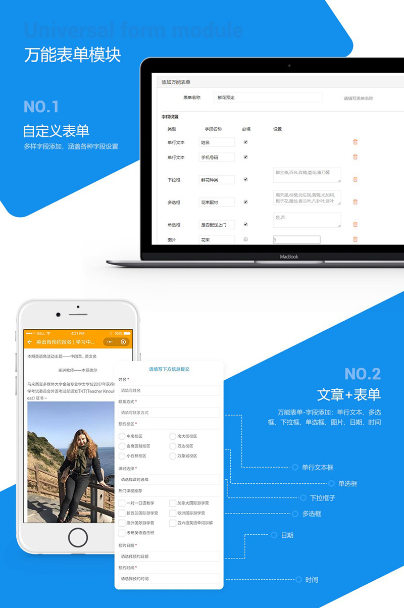 超强大的自定义表单模块,不同行业和岗位的人员不需要特殊技能,都可以方便的创建出符合业务需求的表单小程序。数据收集,简单方便,客户登记、意见反馈、活动报名等轻松搞定。万能表单自动收集并整理数据,帮助用户节省工作时间,高效率、更便捷的完成工作。